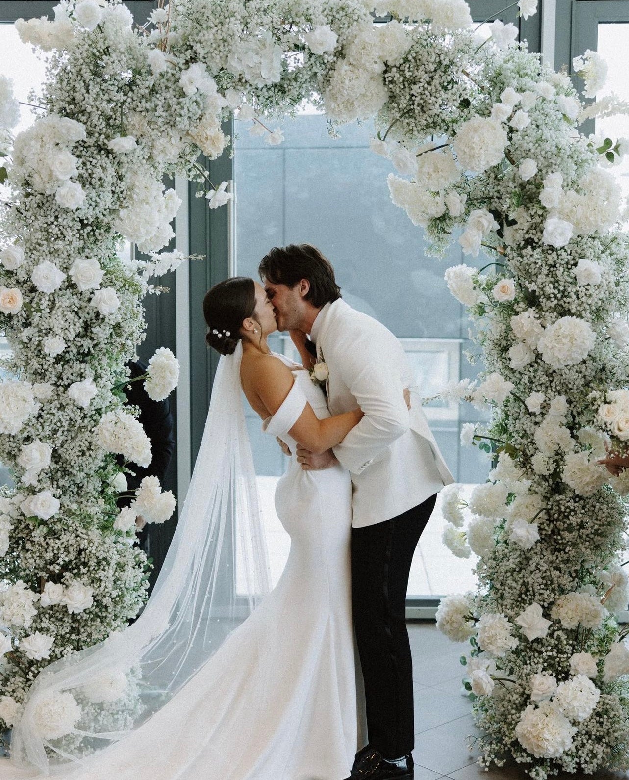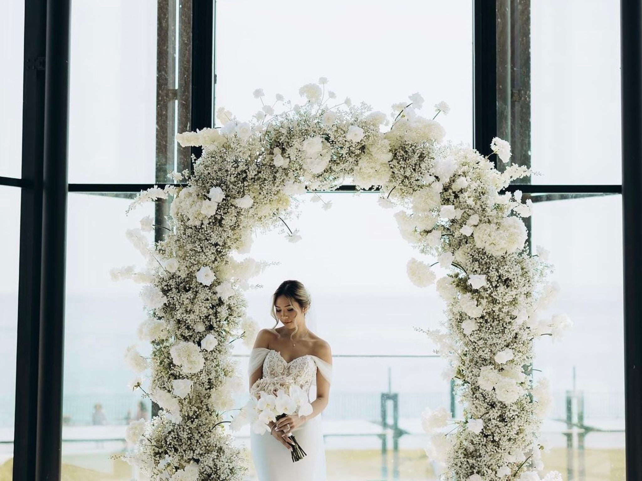 All arrangements are made with the most current trending designs! Most popular are baby's breath, blushes, and overgrown greenery in arches and pillars.