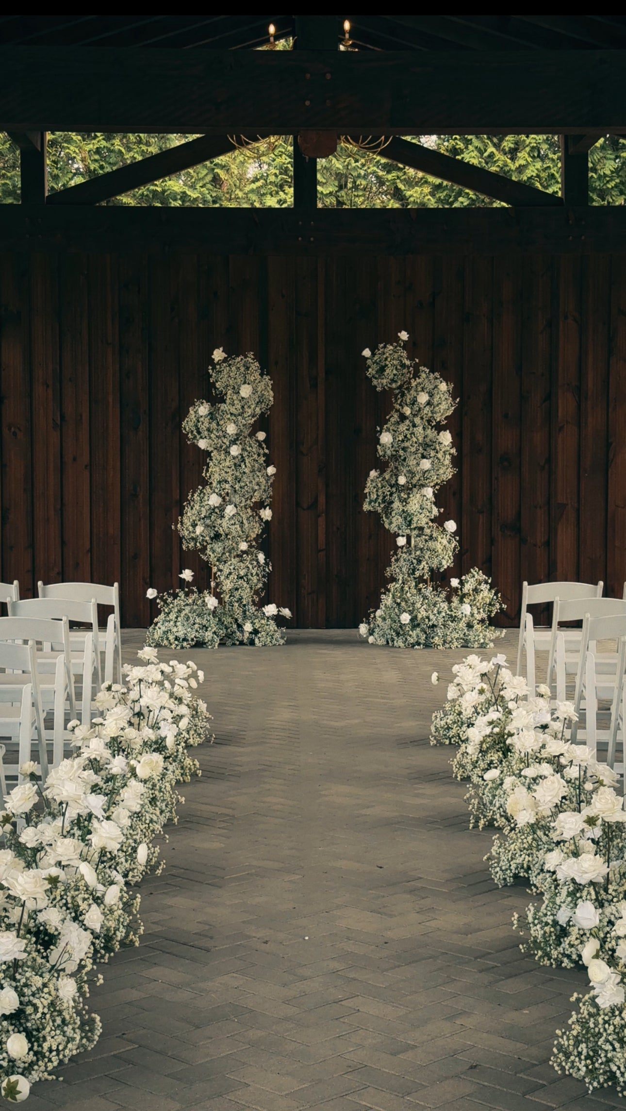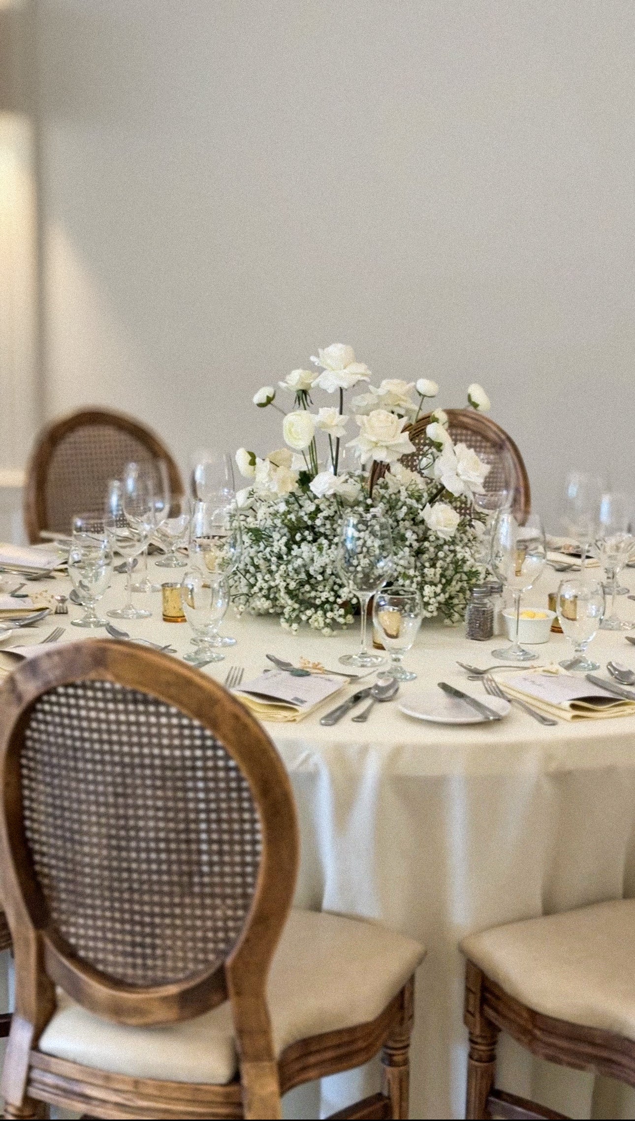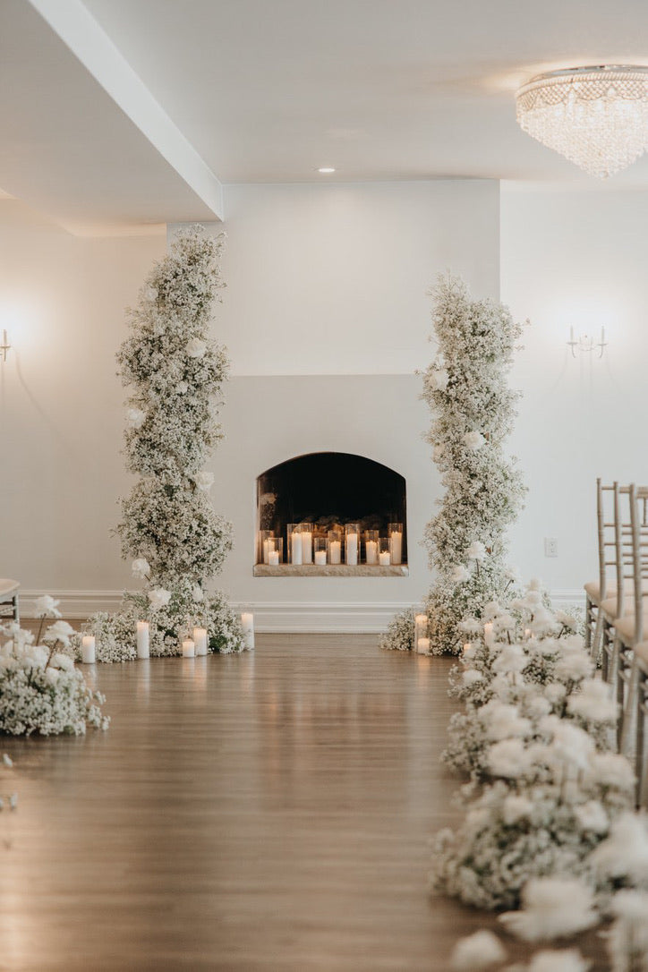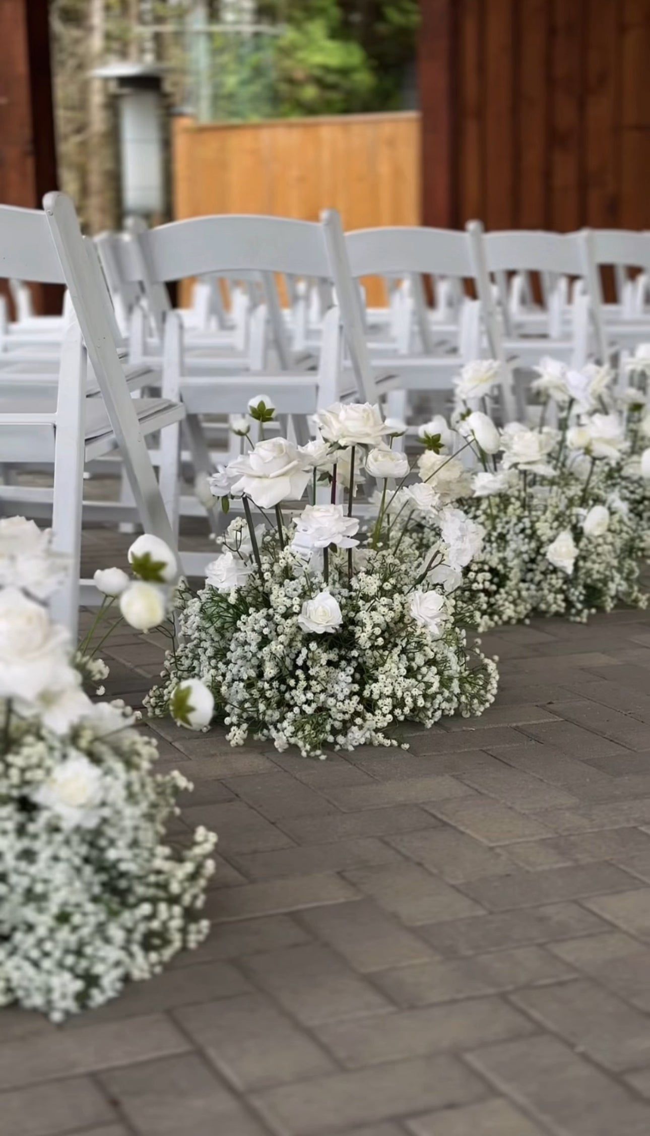 The popular Aurora Arrangements; This was initially created to go on tables as a centrepiece, but it has had a popular use as being first re-purposed as aisle markers! This centrepiece has varying heights of real touch roses, ranunculus, and scabiosa, nestled in a bed of soft-touch baby's breath. Not suitable for tables smaller than 62", or rectangular tables smaller than 4ft in width, as there would be very minimal room left for candles or centre food. If you need smaller arrangements for circular tables, have a look at the smaller round aisle arrangements/table centrepieces!