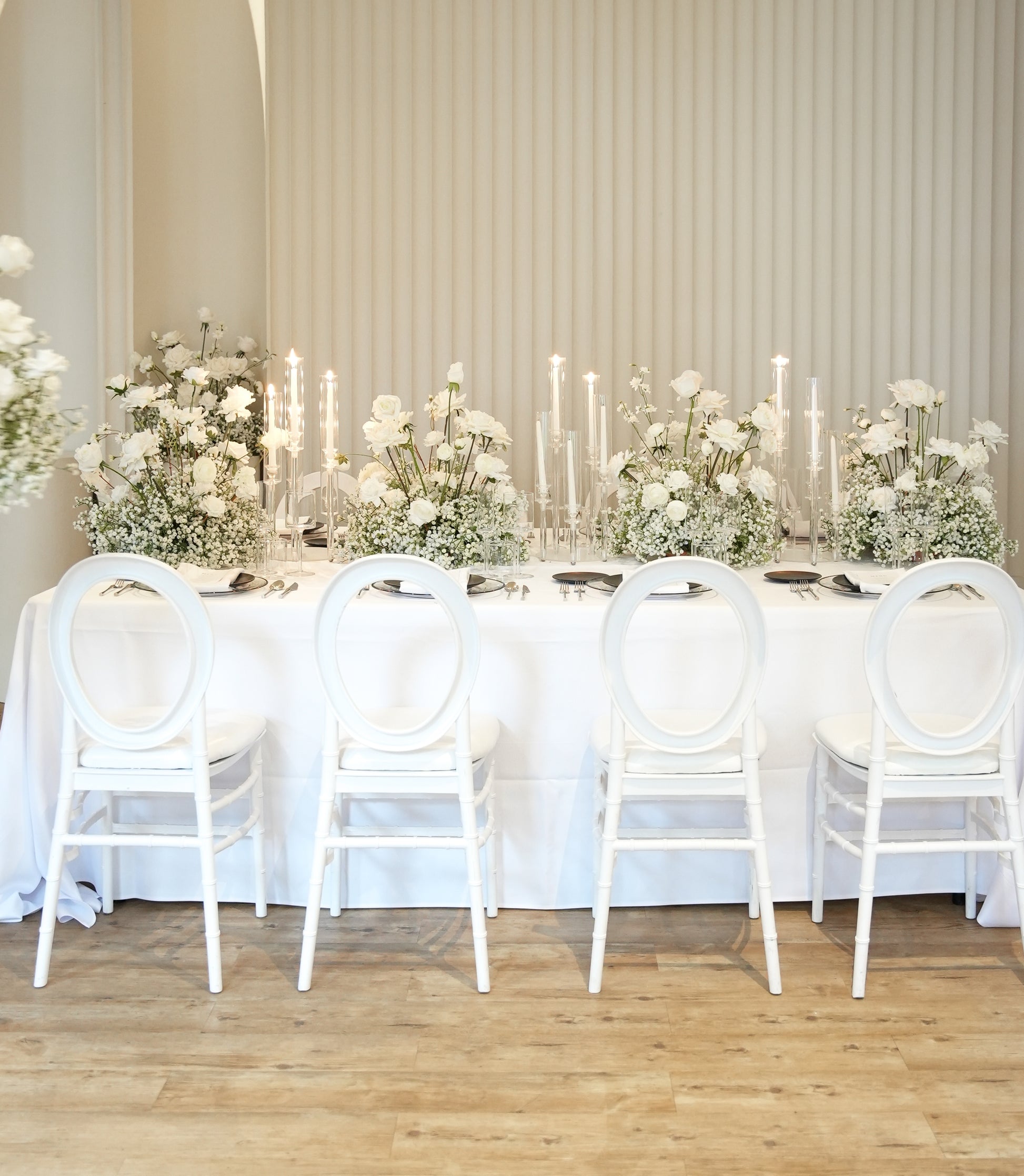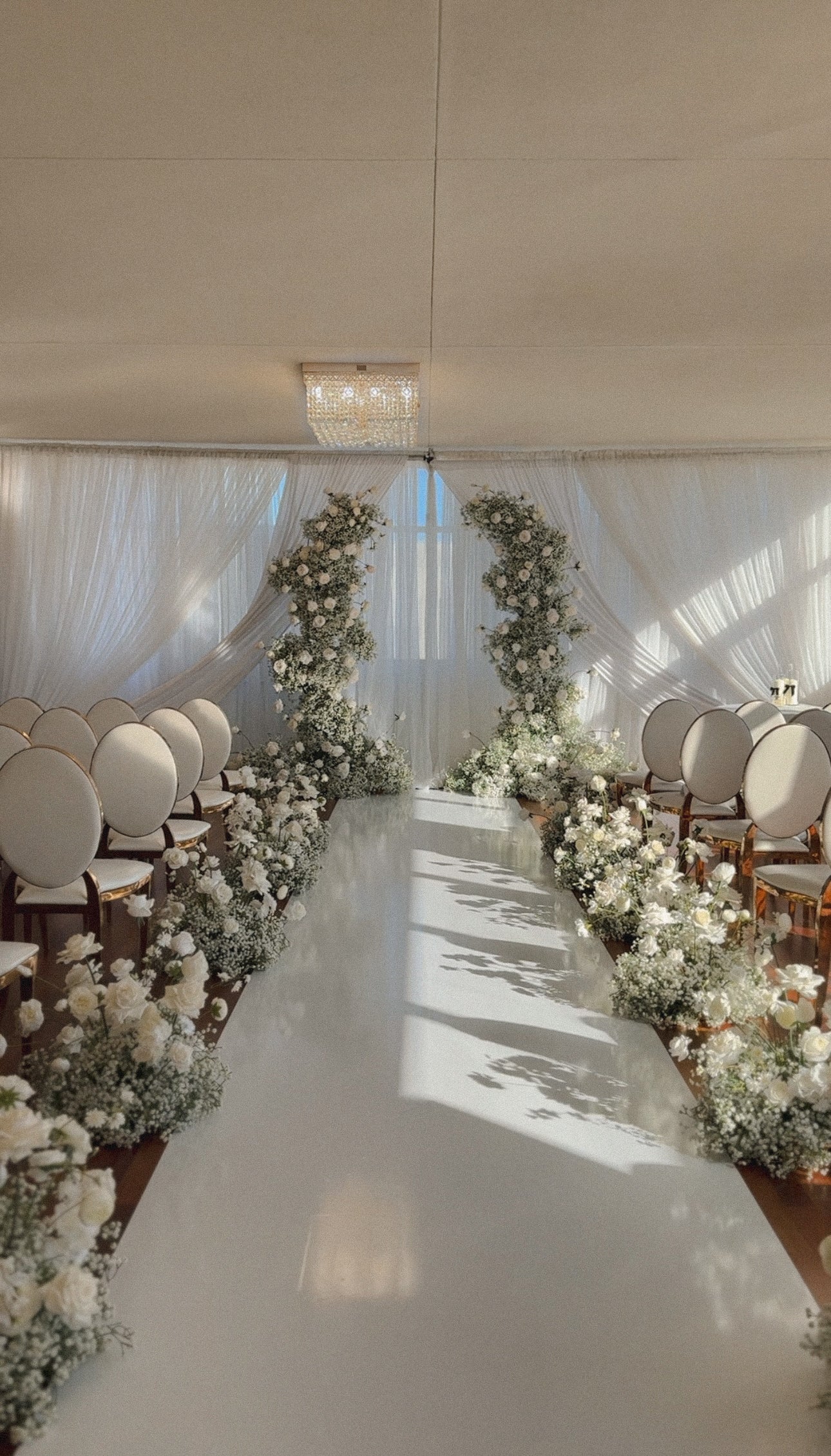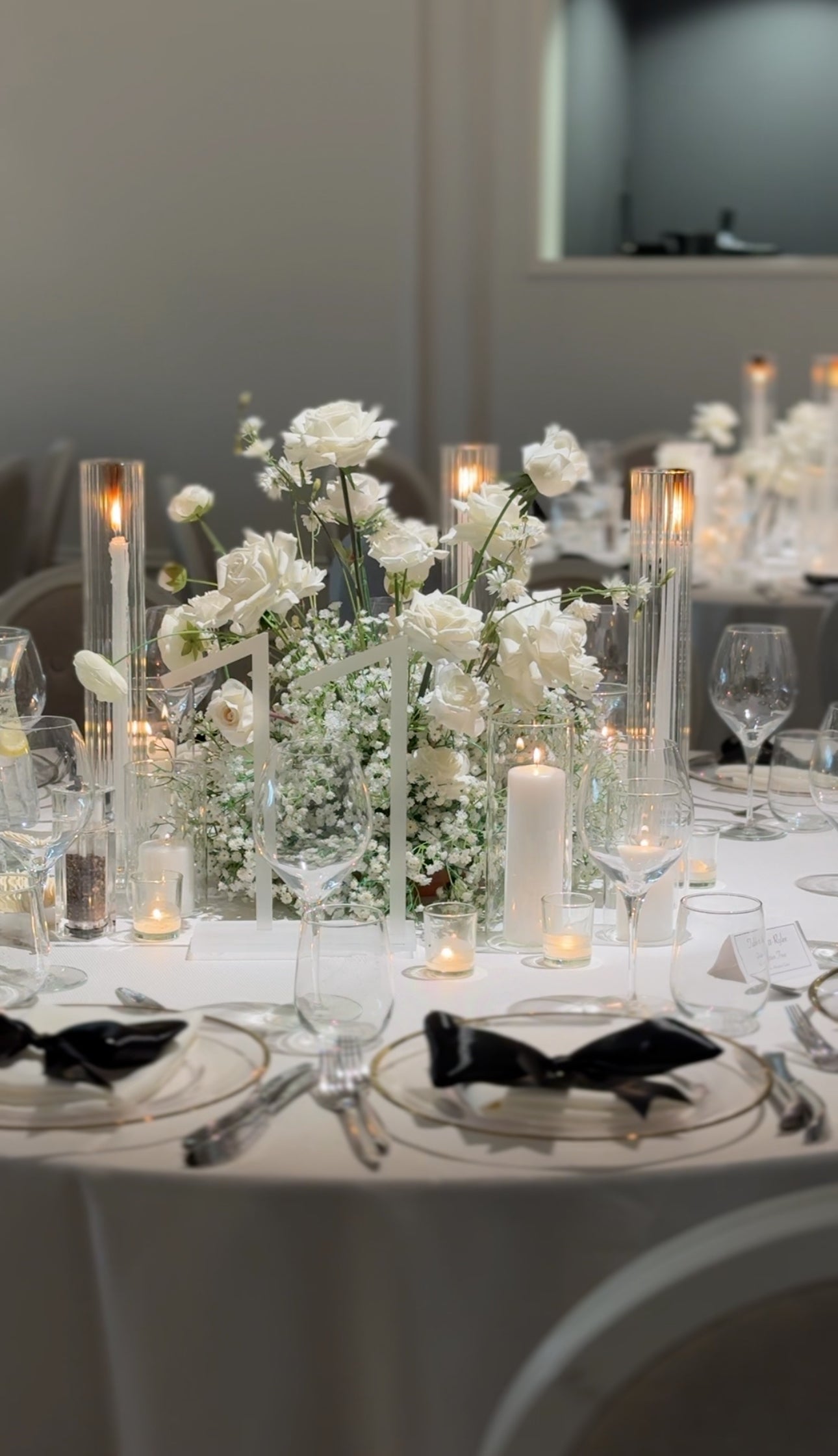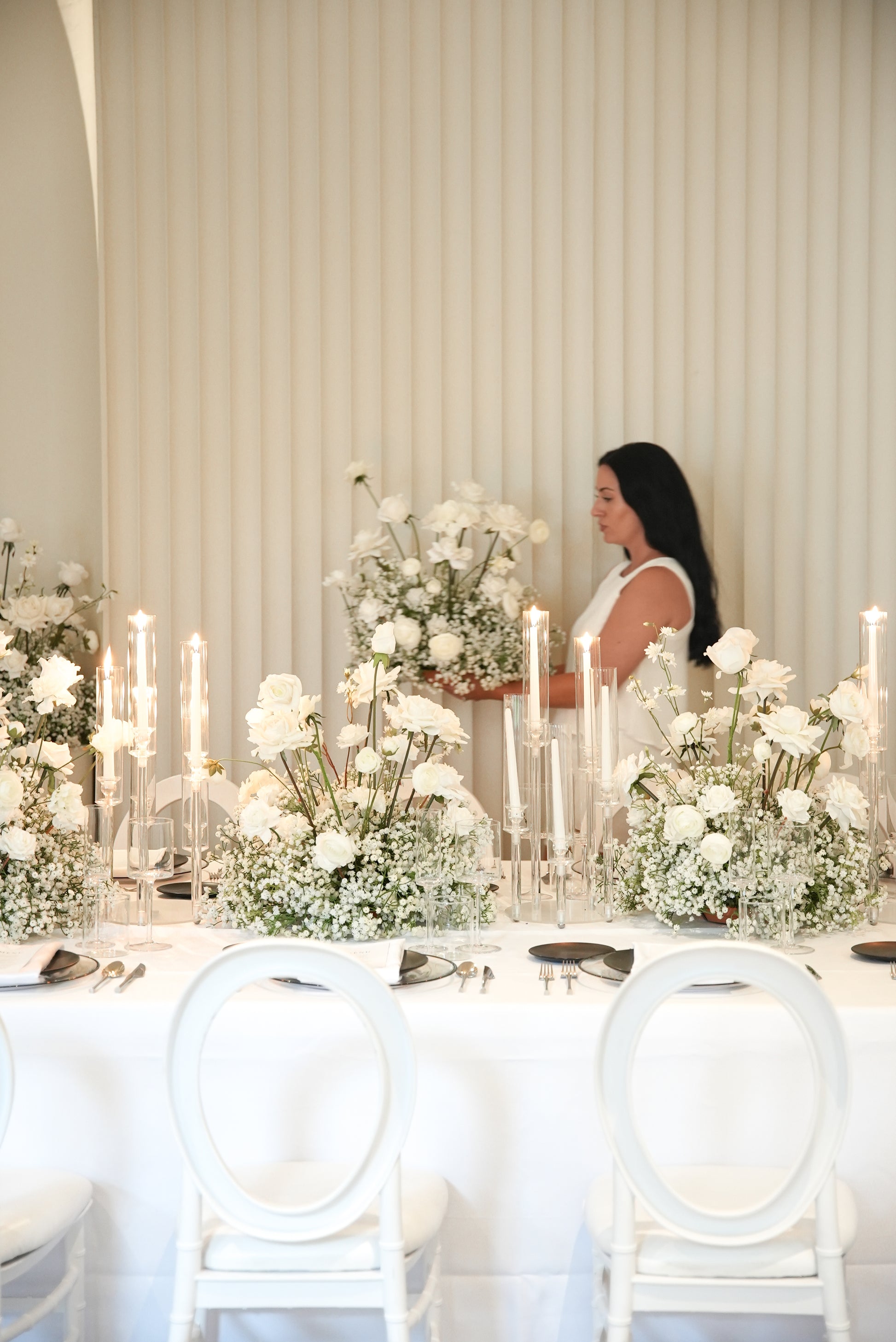 The popular Aurora Arrangements; This was initially created to go on tables as a centrepiece, but it has had a popular use as being first re-purposed as aisle markers! This centrepiece has varying heights of real touch roses, ranunculus, and scabiosa, nestled in a bed of soft-touch baby's breath. Not suitable for tables smaller than 62", or rectangular tables smaller than 4ft in width, as there would be very minimal room left for candles or centre food. If you need smaller arrangements for circular tables, have a look at the smaller round aisle arrangements/table centrepieces!