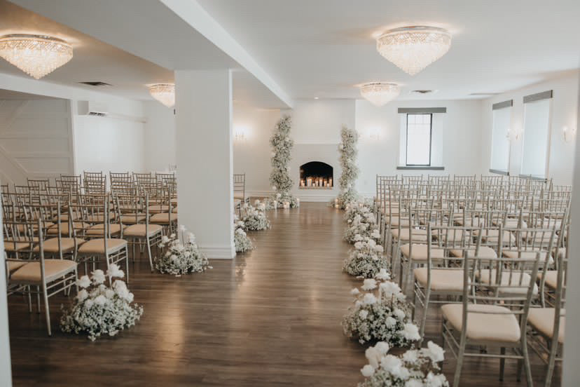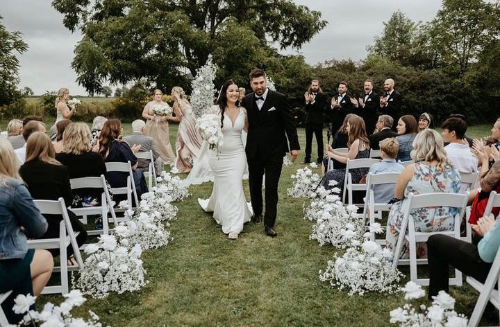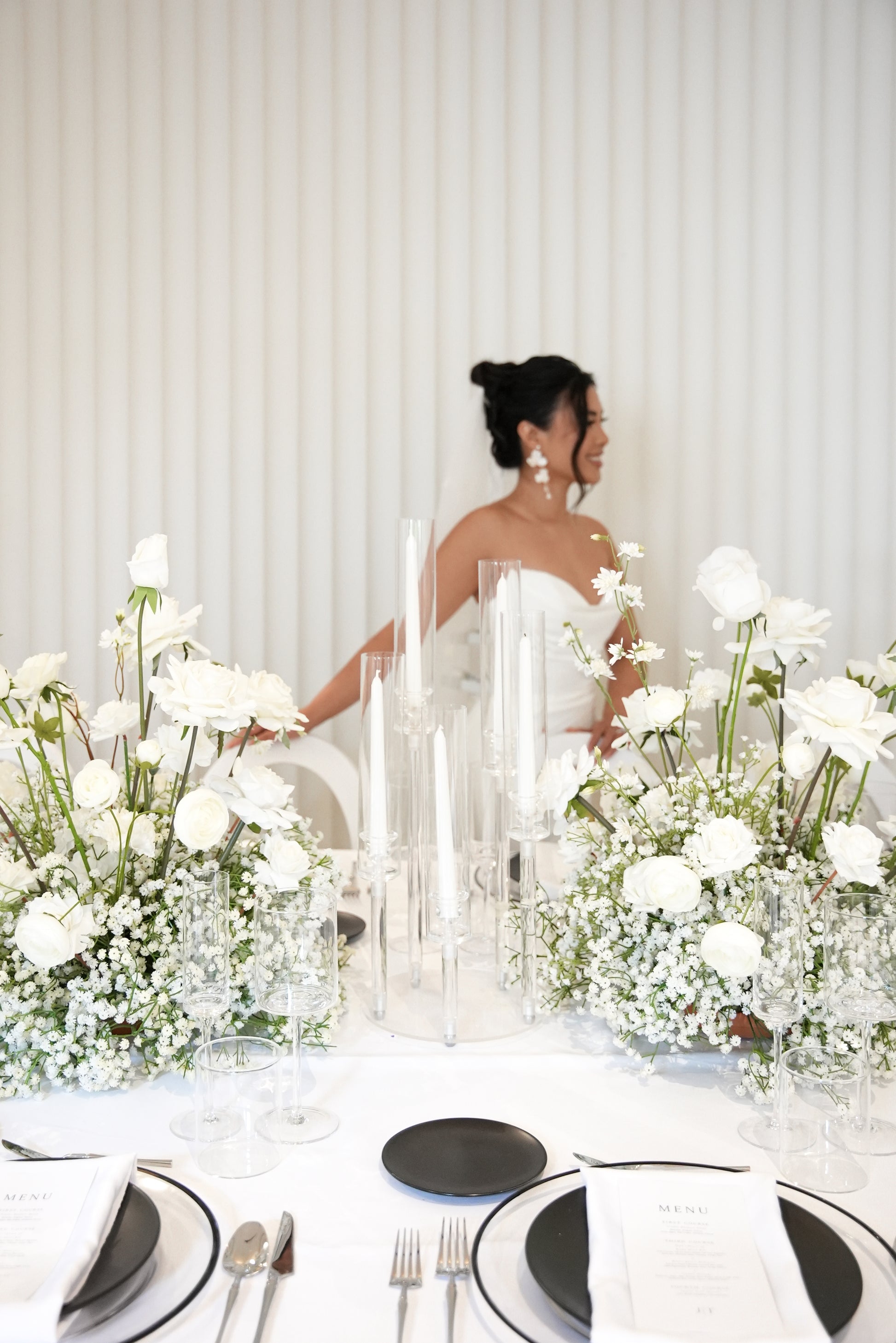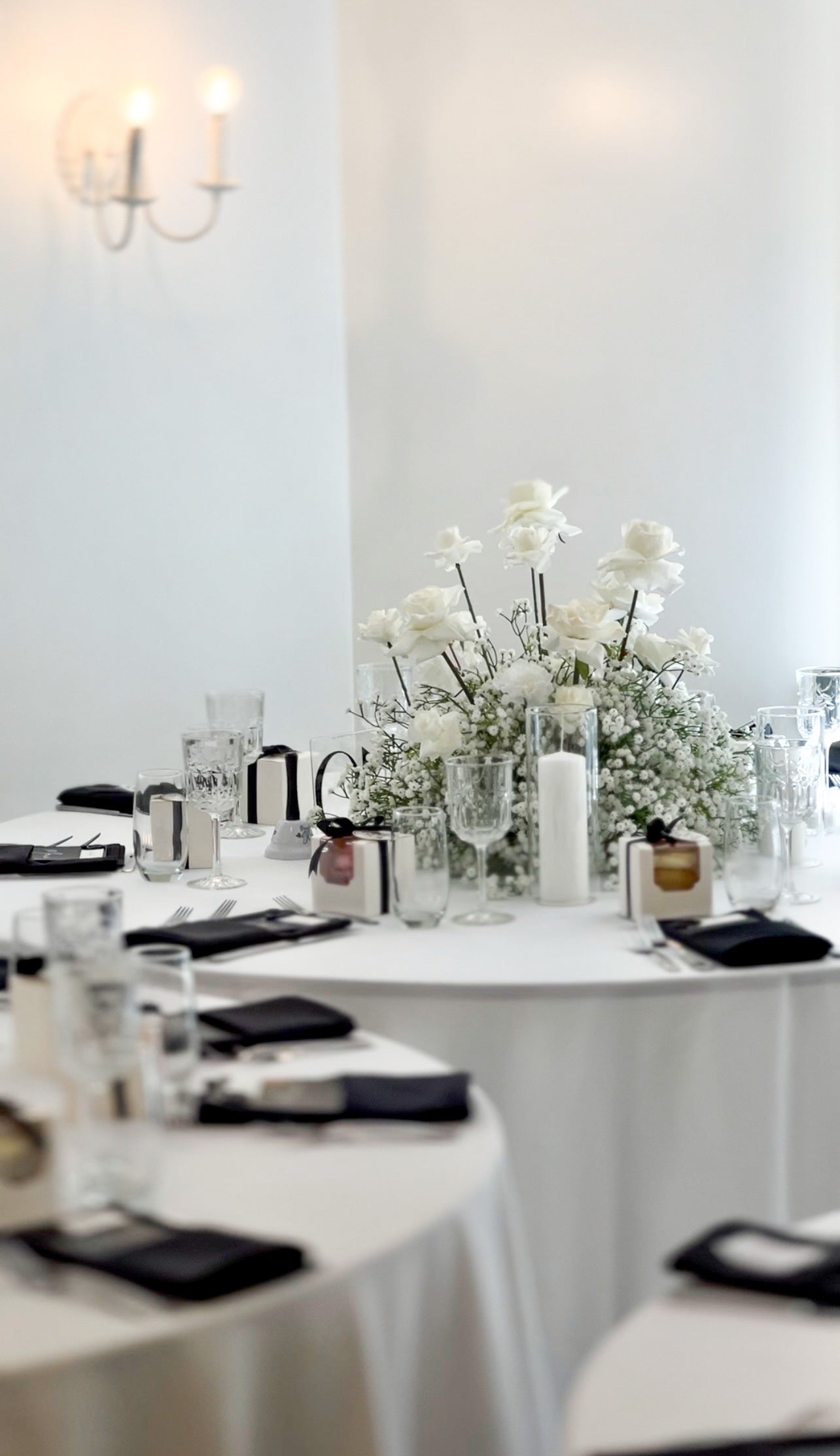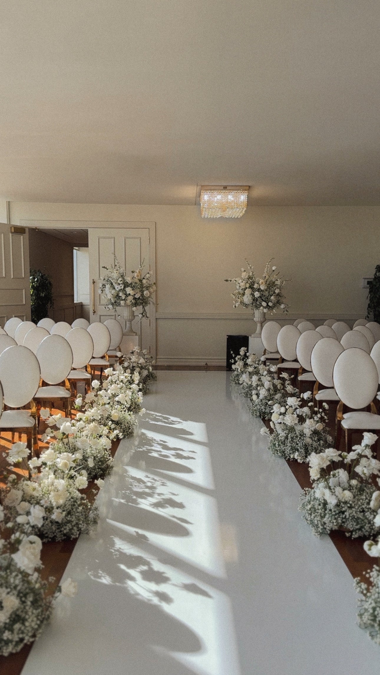 The popular Aurora Arrangements; This was initially created to go on tables as a centrepiece, but it has had a popular use as being first re-purposed as aisle markers! This centrepiece has varying heights of real touch roses, ranunculus, and scabiosa, nestled in a bed of soft-touch baby's breath. Not suitable for tables smaller than 62", or rectangular tables smaller than 4ft in width, as there would be very minimal room left for candles or centre food. If you need smaller arrangements for circular tables, have a look at the smaller round aisle arrangements/table centrepieces!