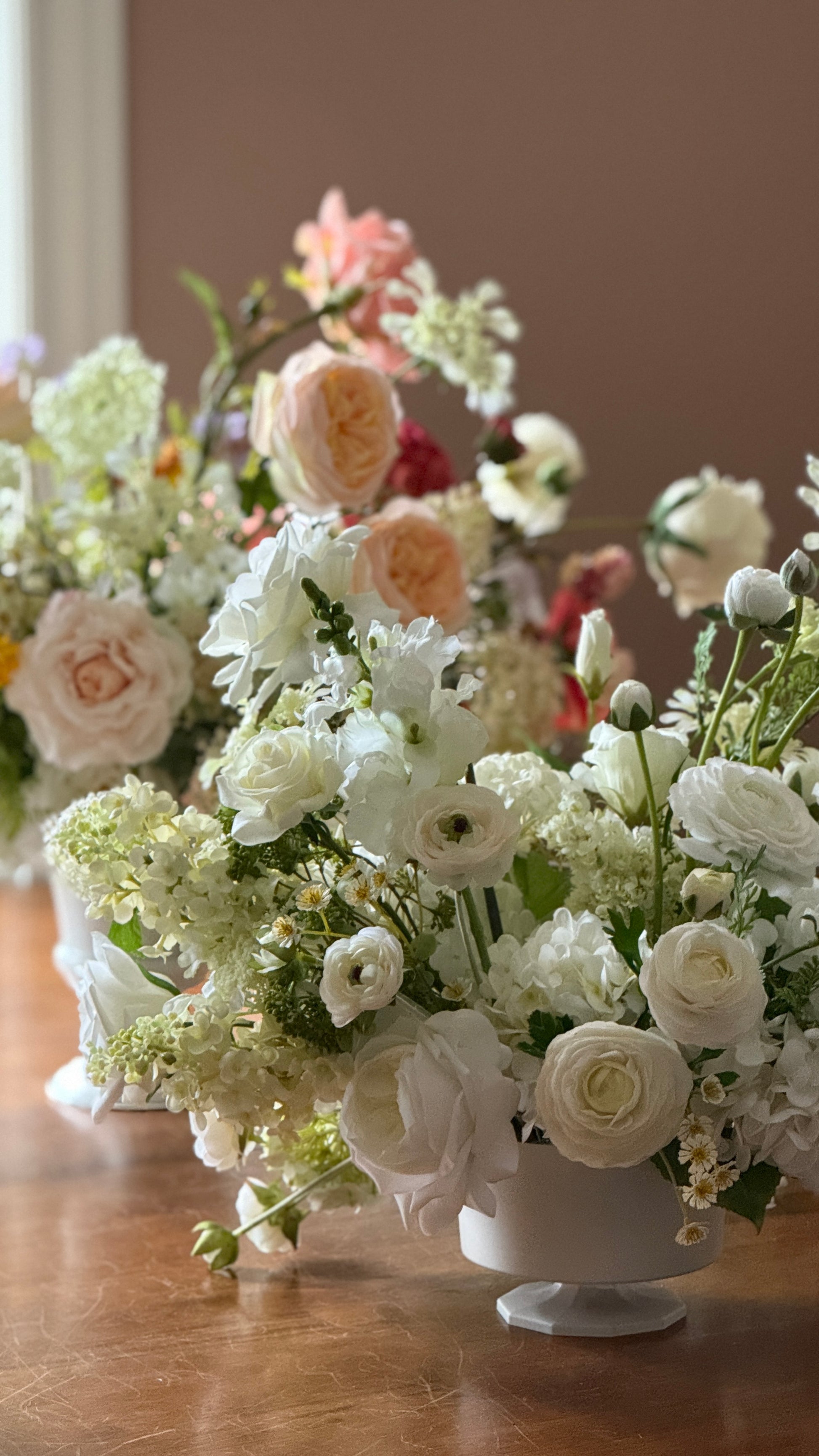 These delphinium centrepieces are elevated on a vase, so they can only be used on tables OR for an indoor, flat surface aisle. These centrepieces perfectly match The Delphinium Arch and Aisle!