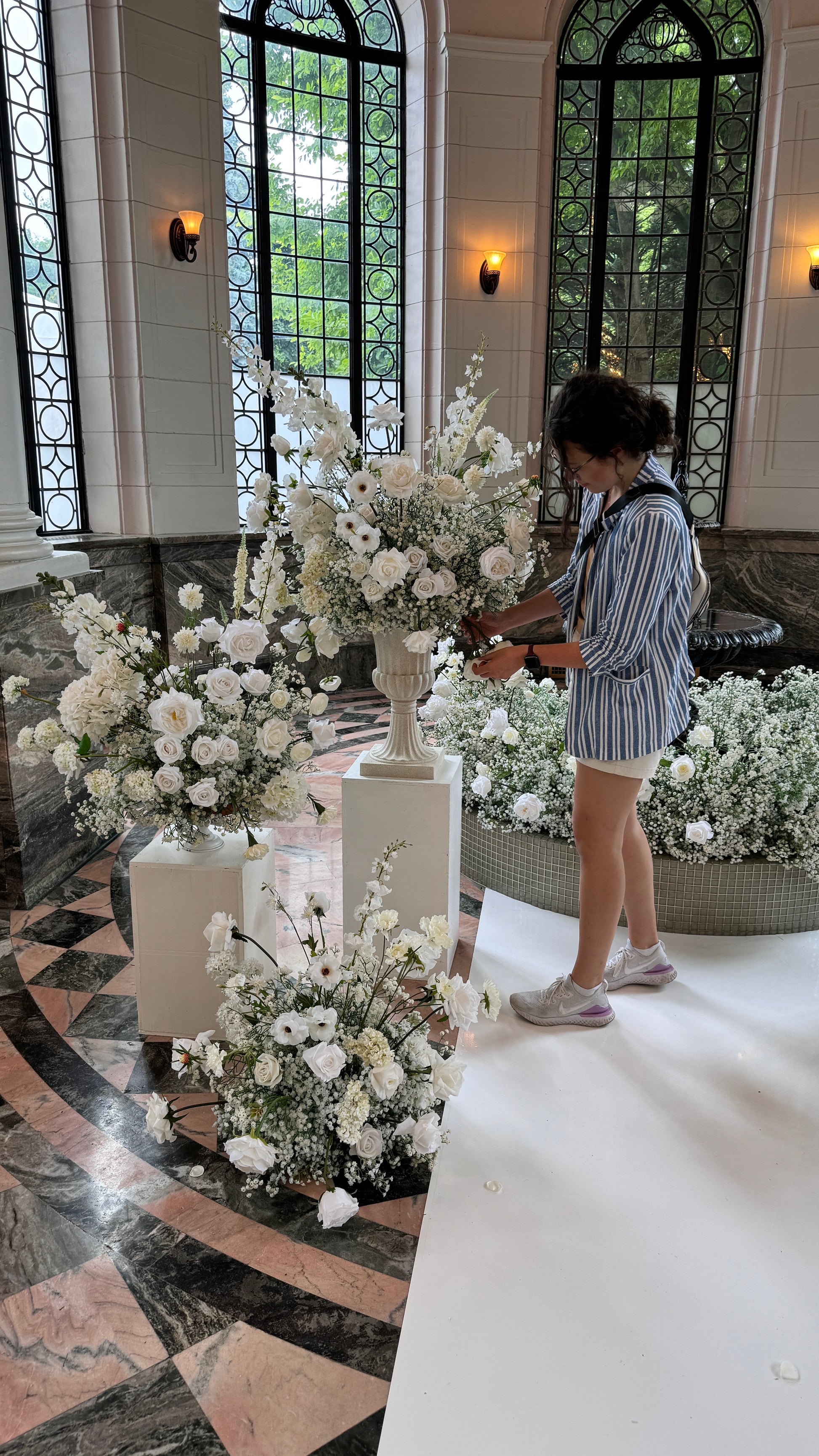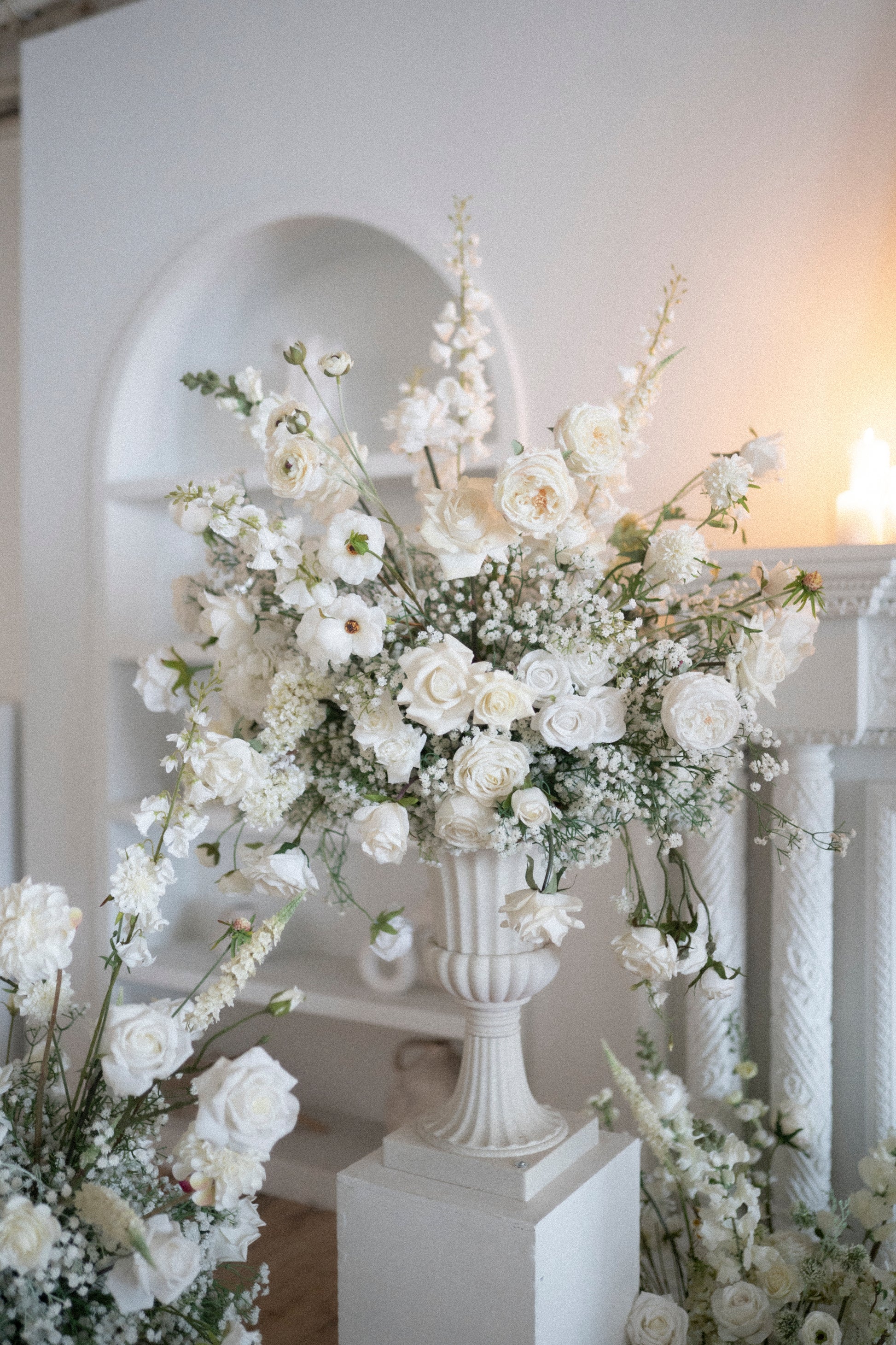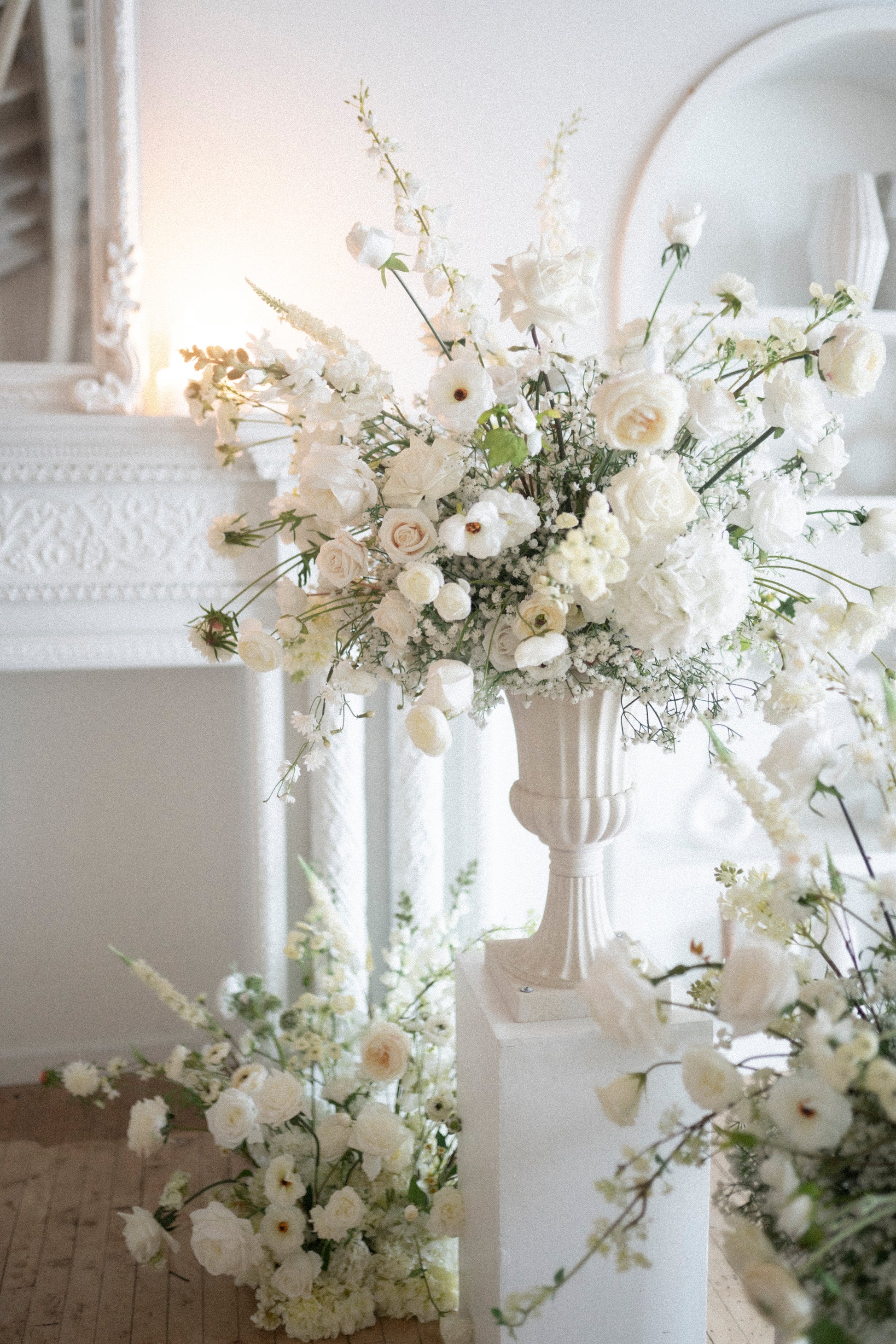 These arrangements just scream luxury, elegance, and... Bridgerton! <3 Made of a bed of baby's breath, and luxury florals such as David Austin roses, delphiniums, garden roses, ranunculus, peonies, and scabiosas!