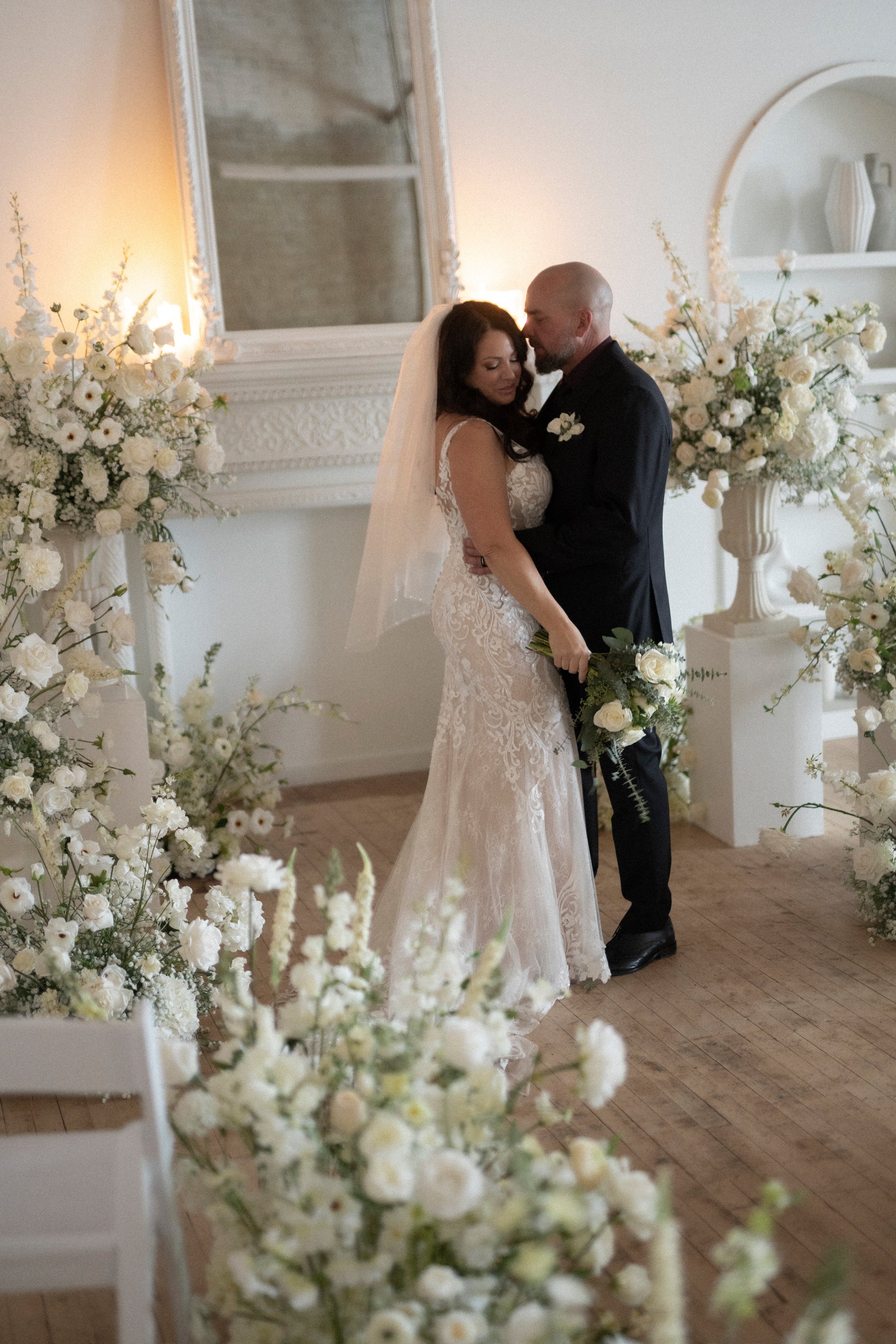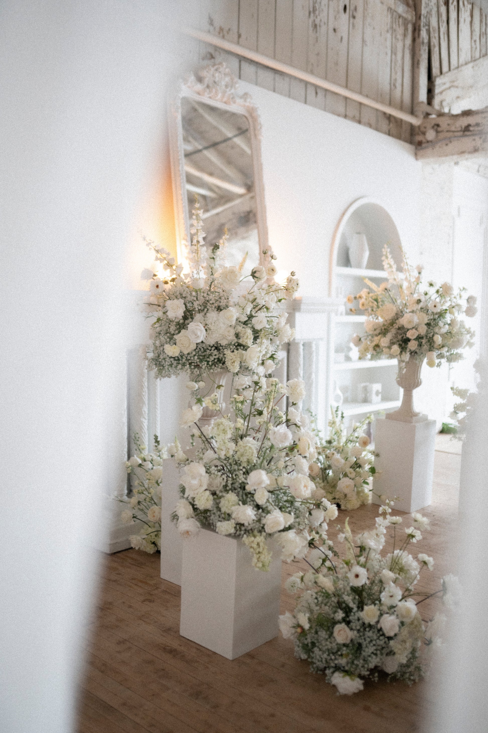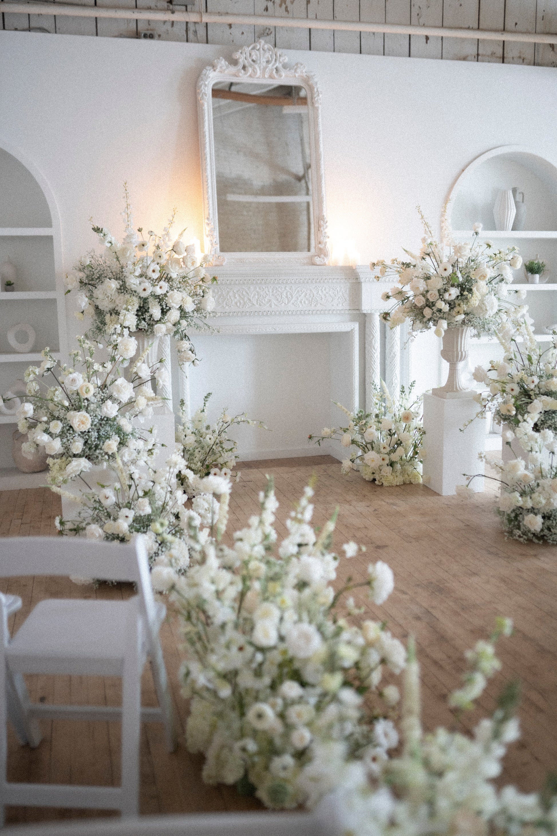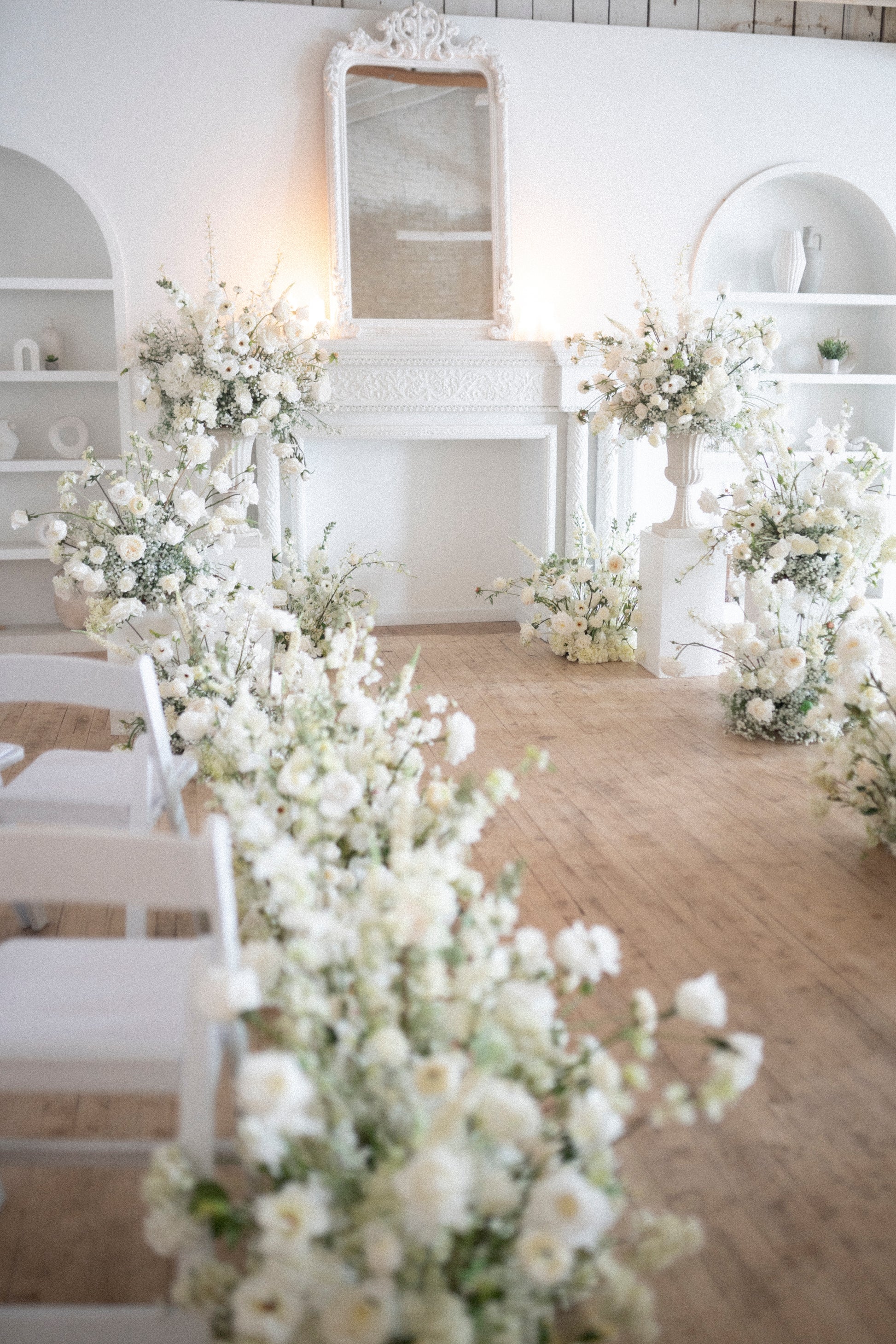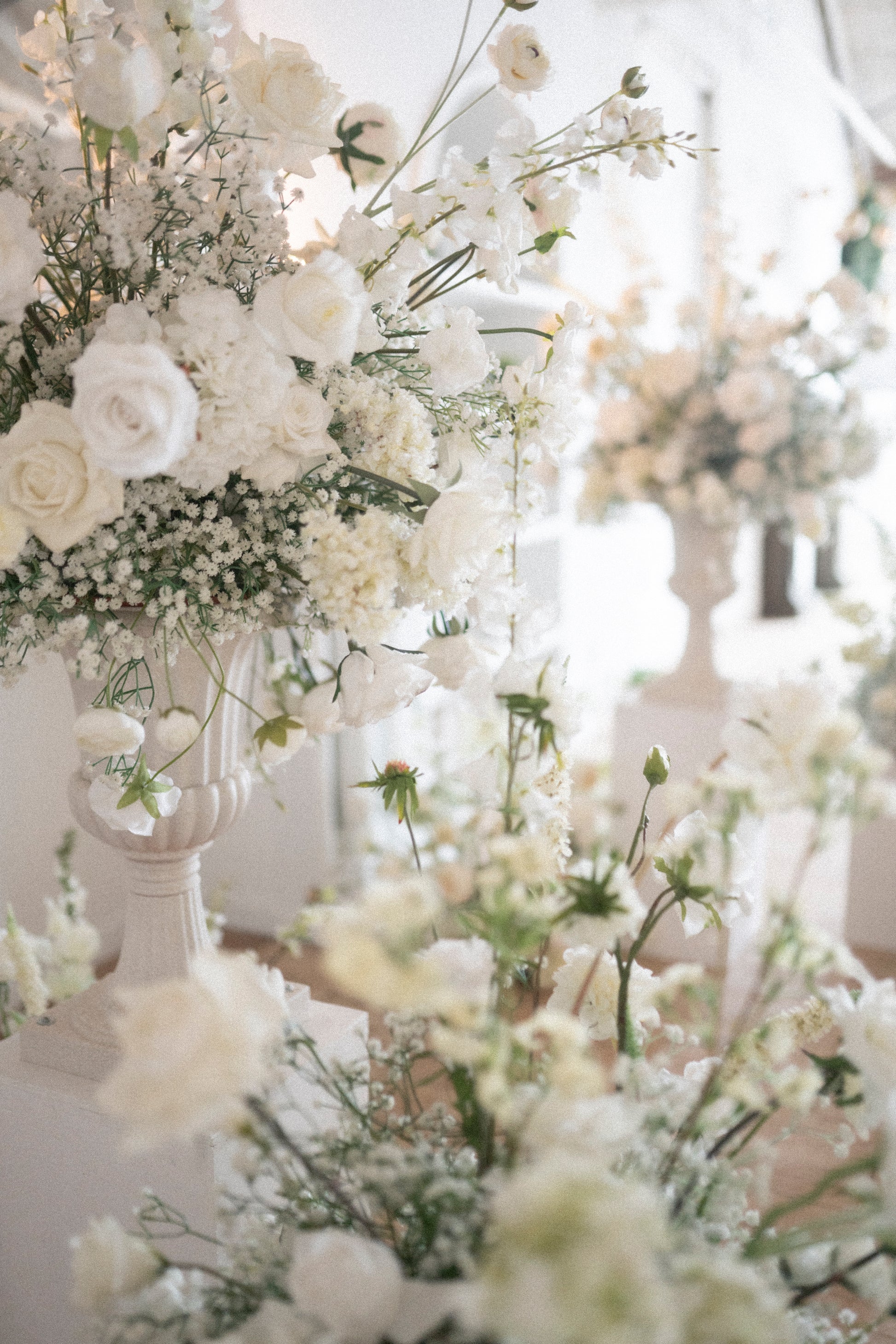 Complete the look with fresh rose petals, and this will be the ultimate dreamy backdrop. Remember, you can re-use any part of these arrangements for the reception! Keep in mind, that the arrangements that are on urns, need to stay elevated, to ensure the florals that drape over the urns, can still be draped and not squished!
