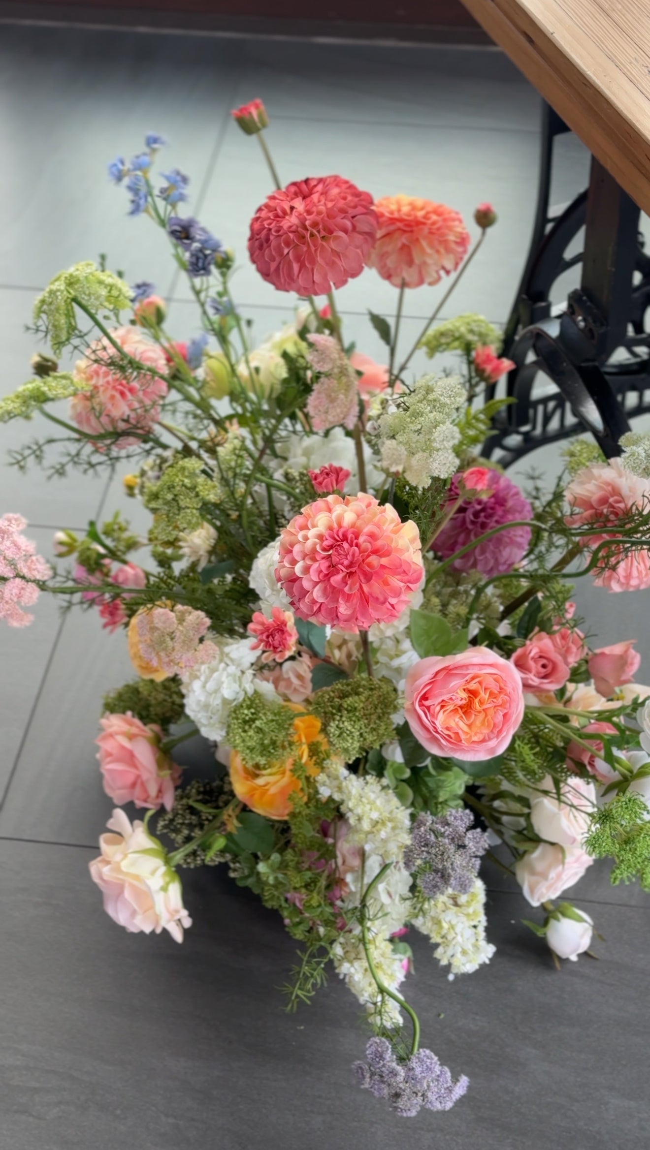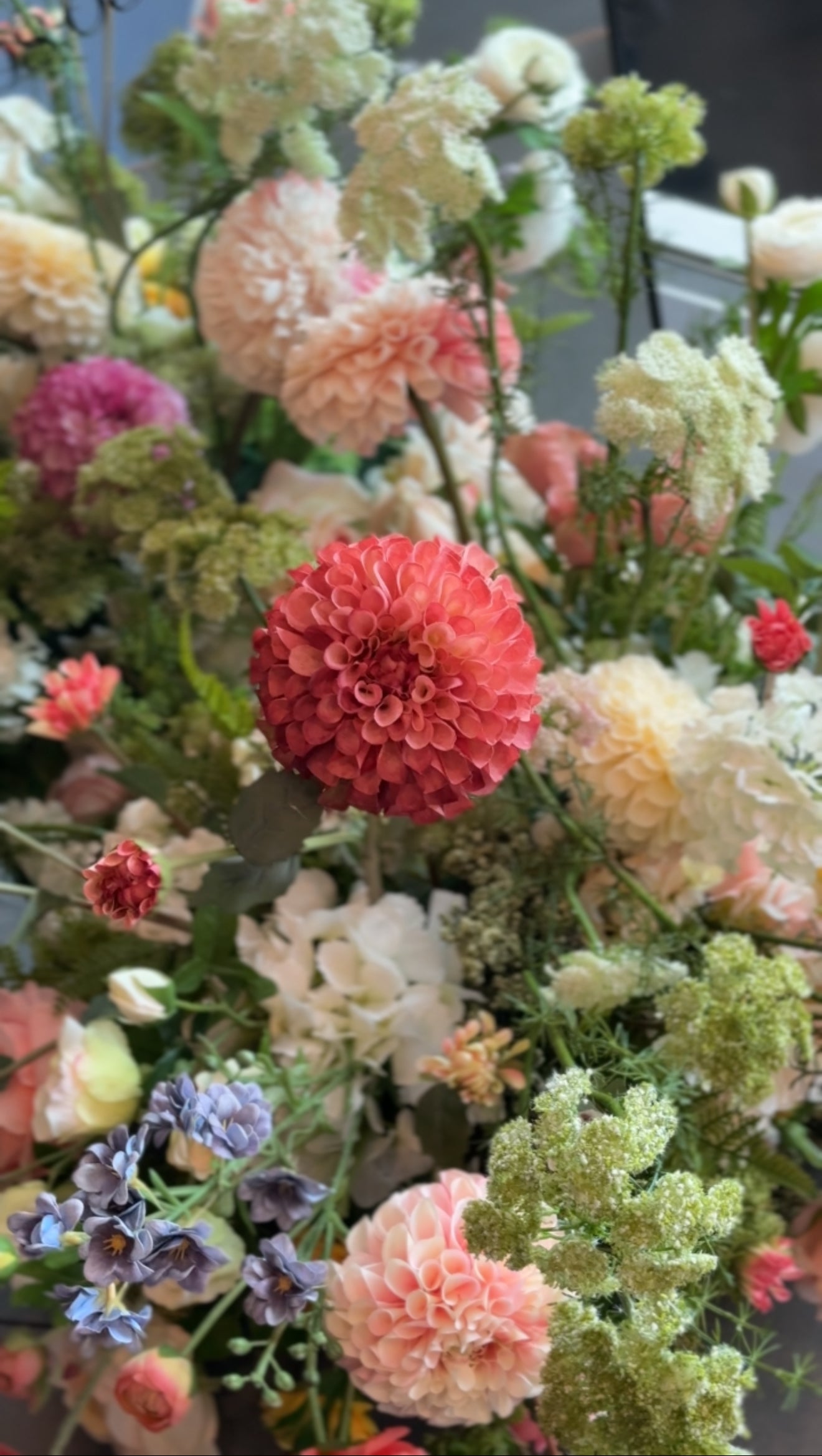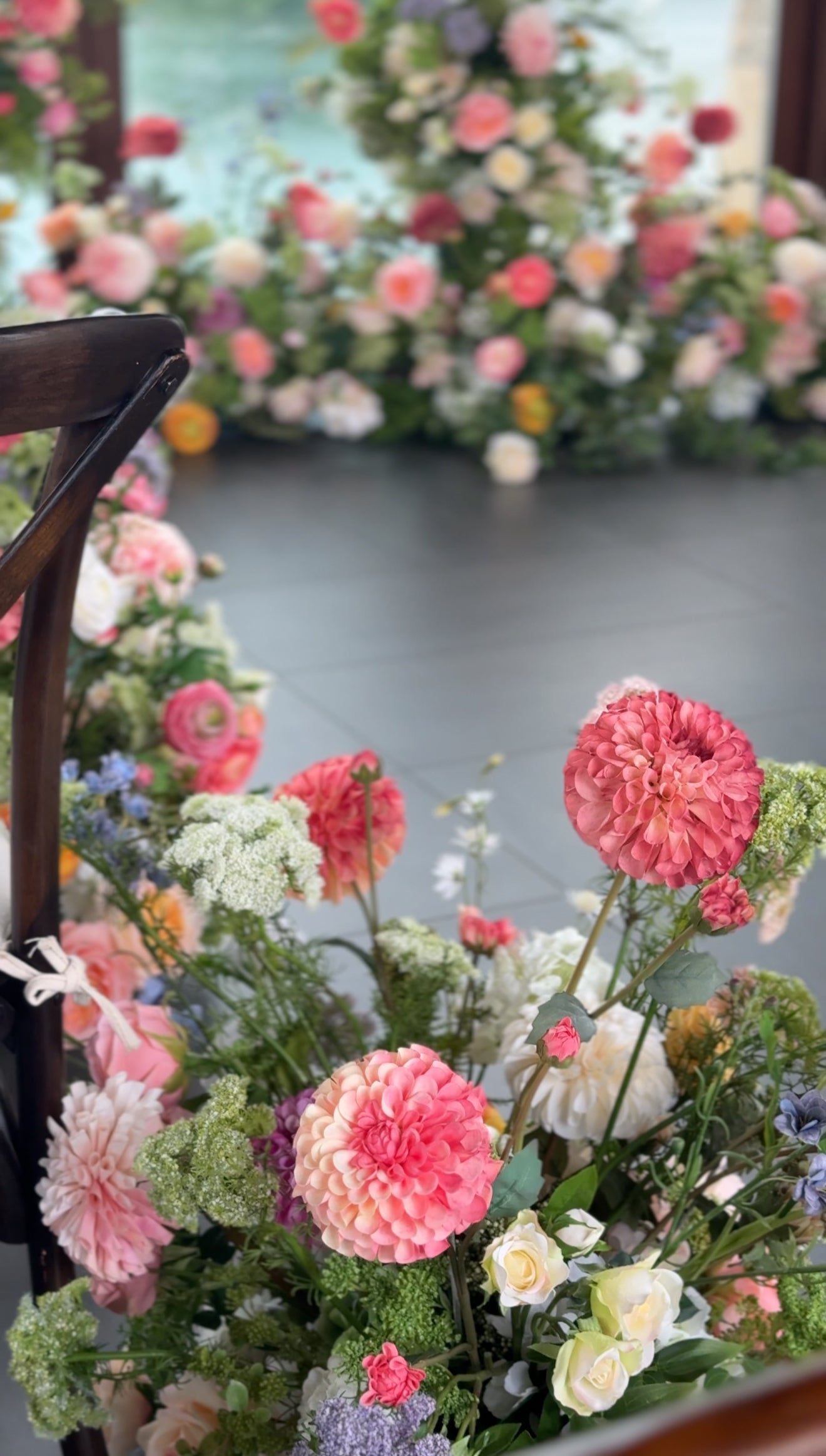 The newest collection! The PERFECT aisle for your golden hour, warm, summer or fall evening wedding. This collection is perfect for your spring, summer, or fall wedding. Full of radiant dahlias, David Austin roses, spray roses, ranunculus, yarrow, Queen Anne's Lace, and all the garden blooms nestled in beautiful green hydrangeas, fern, and greenery.