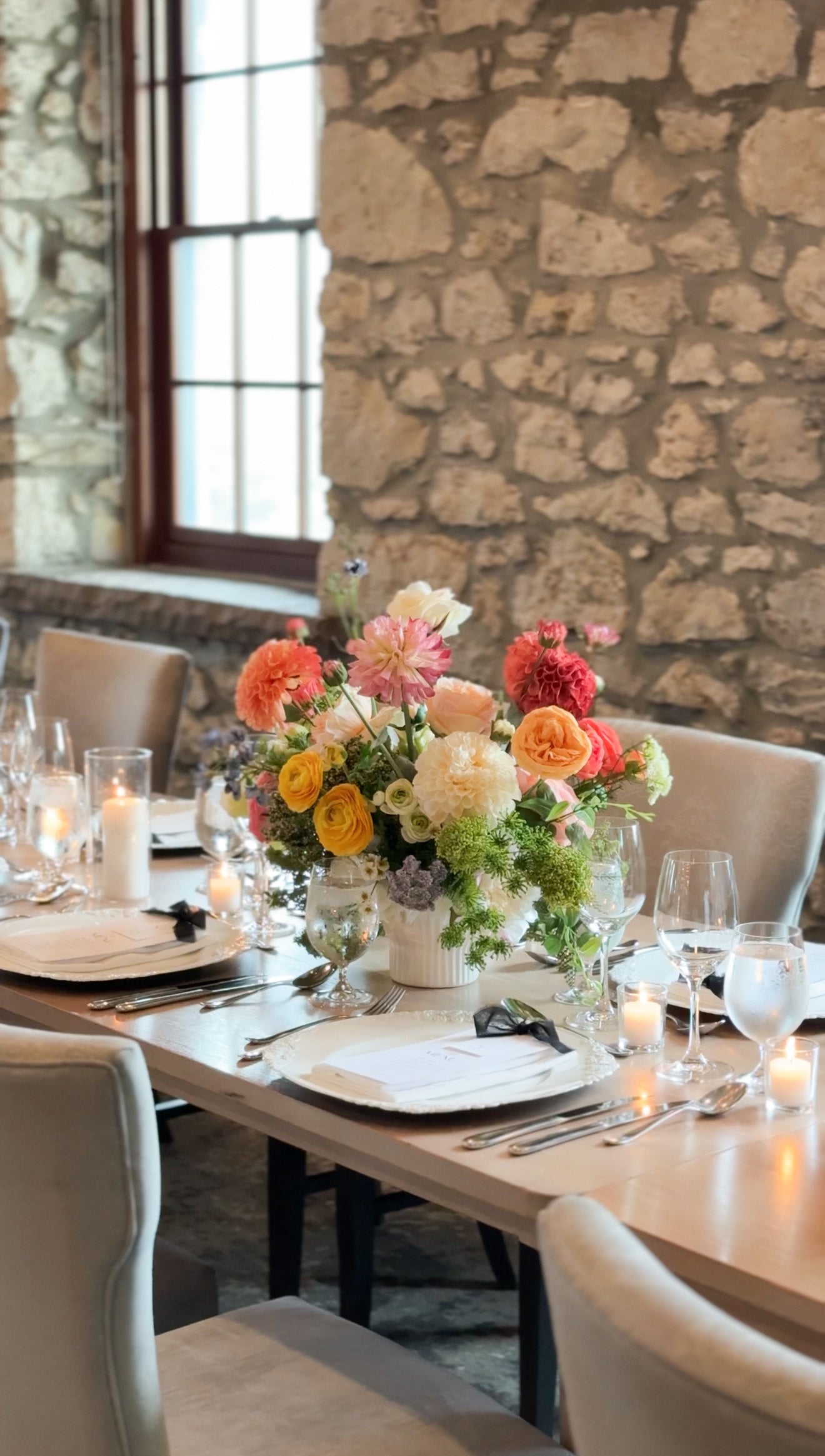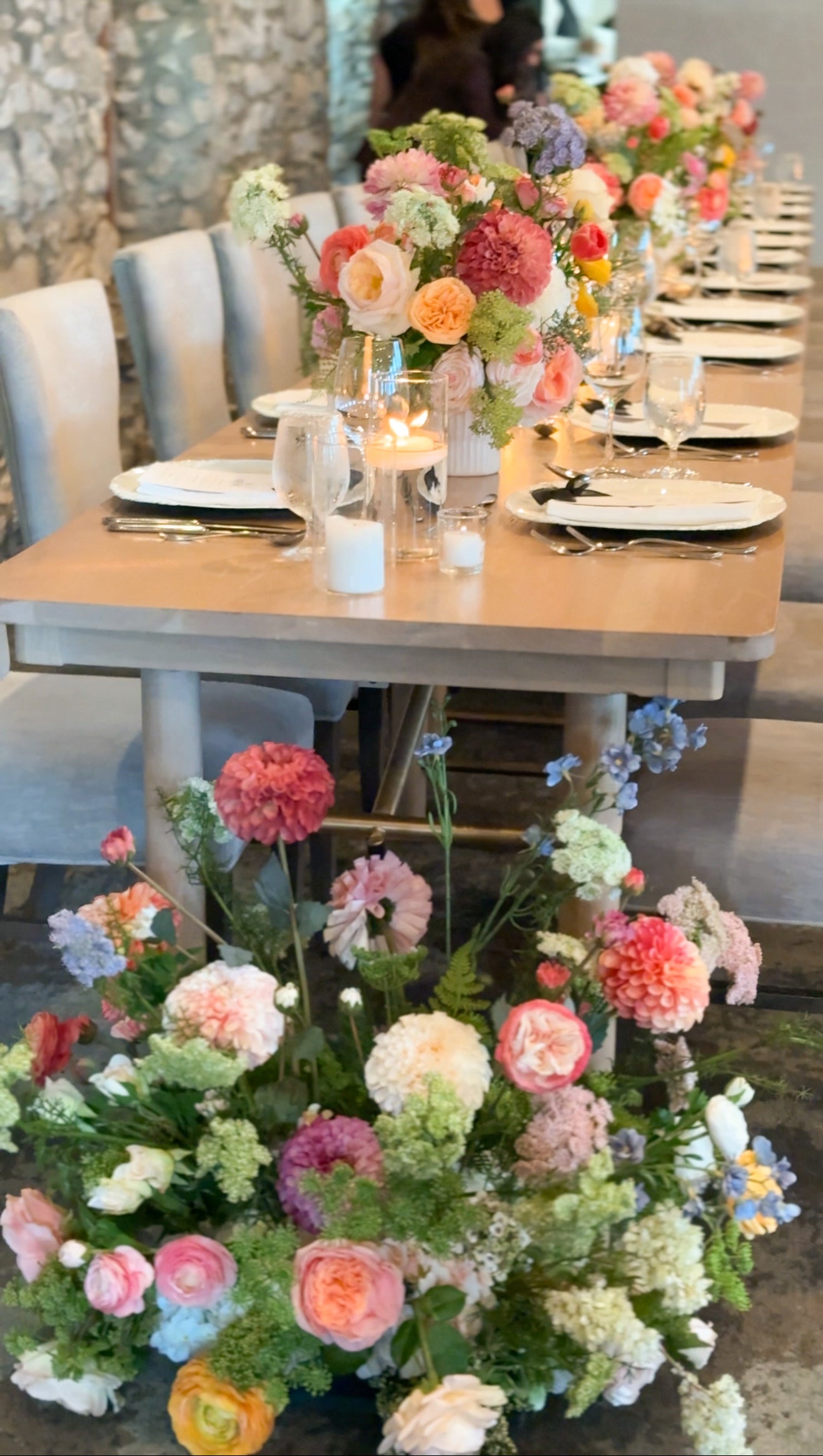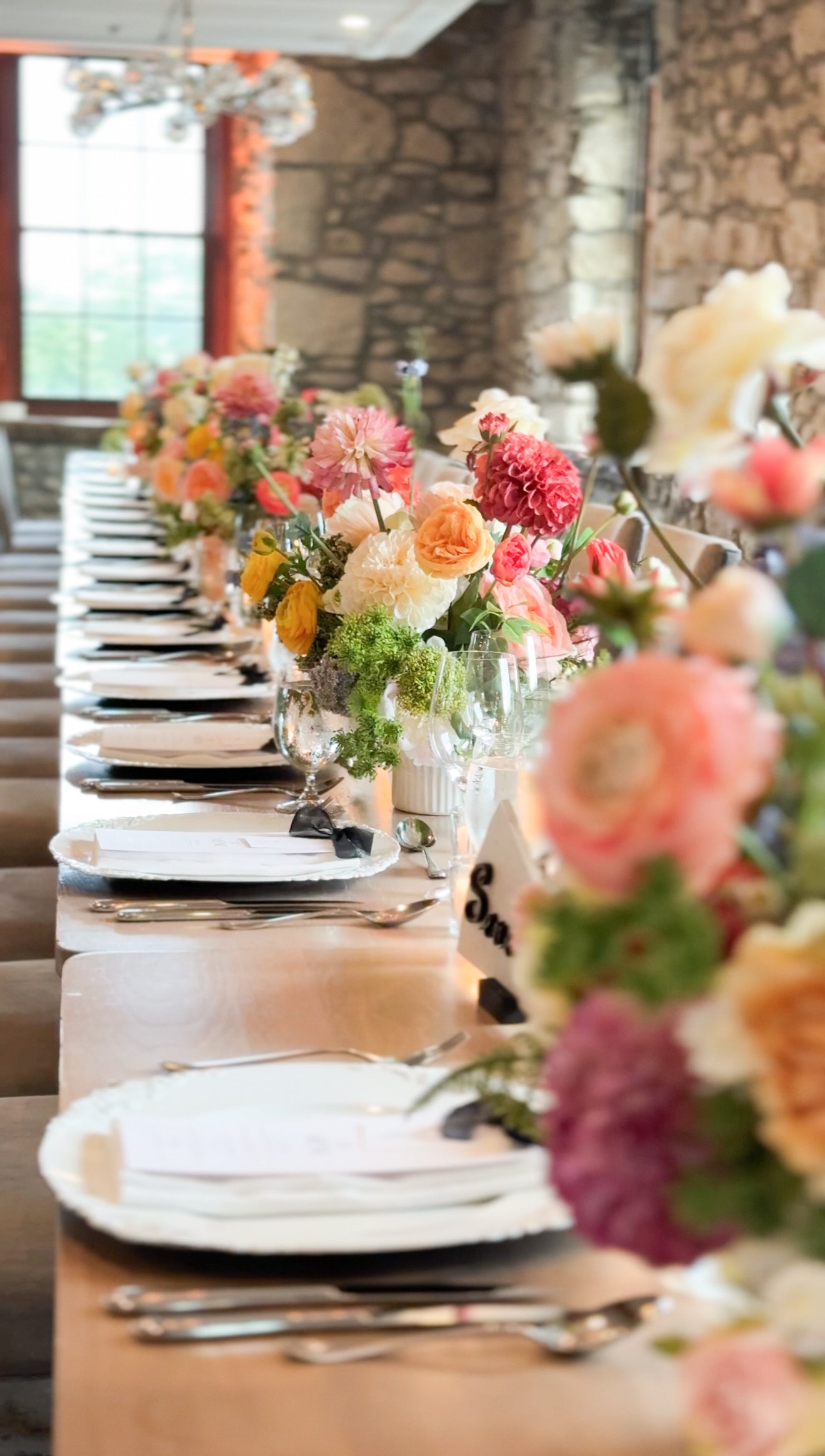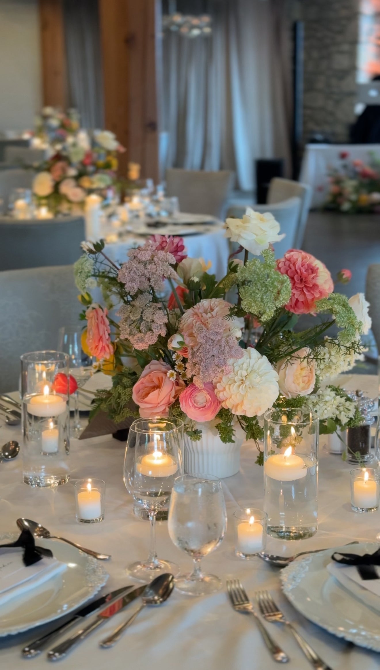 The newest collection of bright peaches, pink, mauves, yellow, lavender, blue, and purple florals! These are the matching centrepieces for The Sunburst Collection. Full of dahlias, David Austin roses, yarrow, Queen Anne's Lace, greenery, ranunculus, and wildflowers!